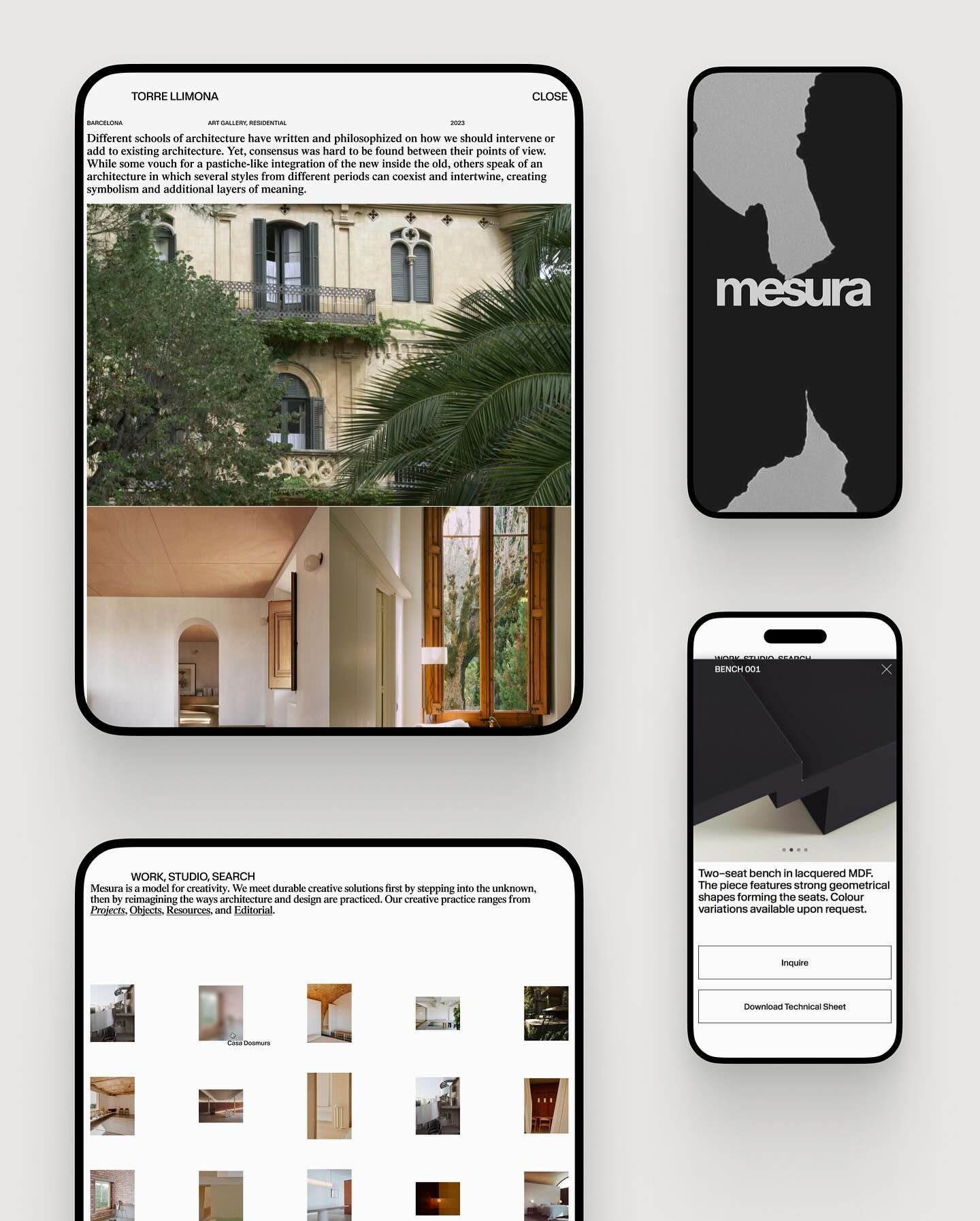 The image presents a clean, minimalist display of architectural photography and branding elements, characterized by high contrast and a focus on texture and form. The visual language is sophisticated, blending natural elements with modern, stark presentation.