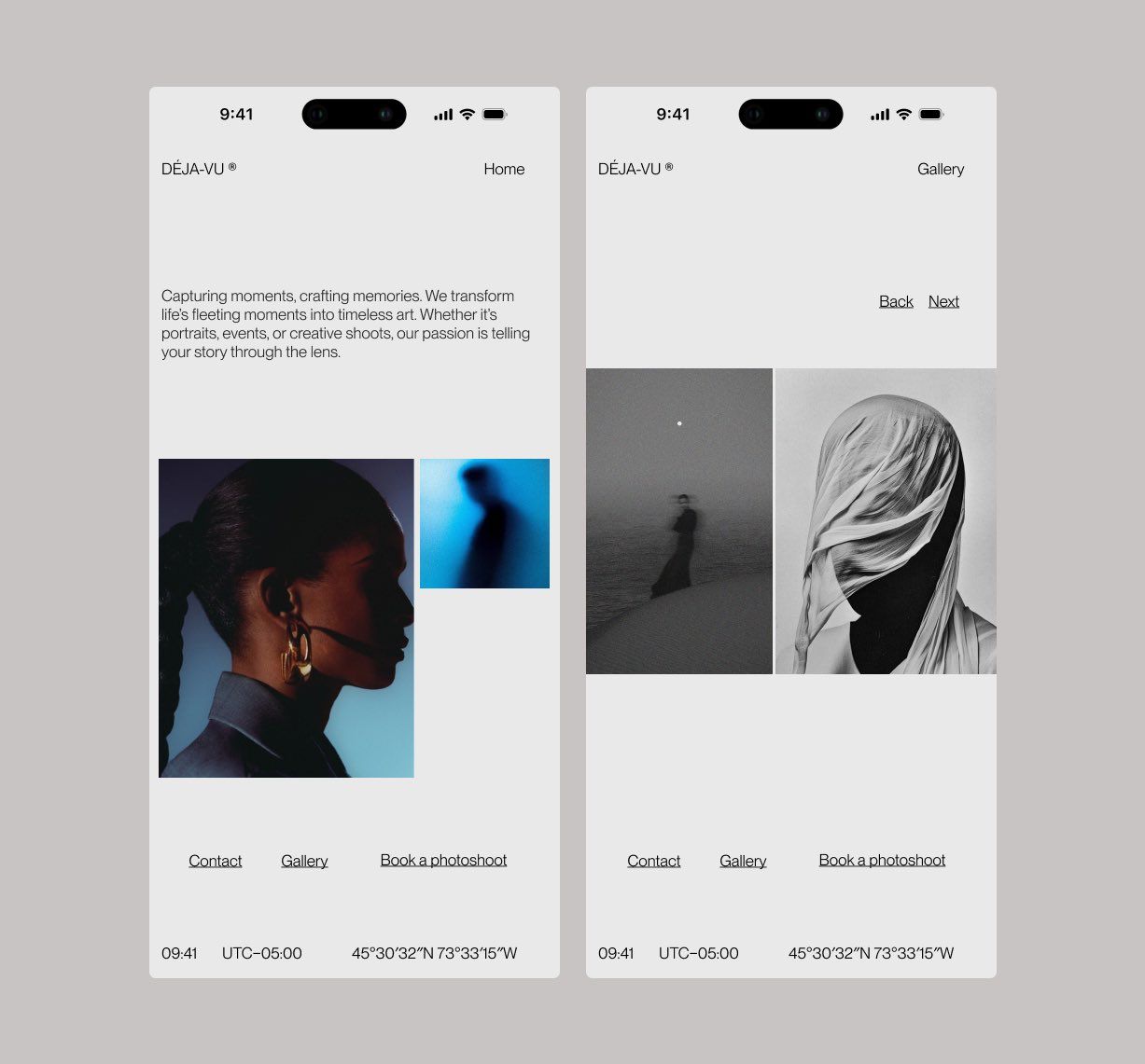 The image displays a clean, minimalist interface design, likely from a mobile application or gallery, featuring two side-by-side photographic previews. The design emphasizes high contrast and a dark theme, suggesting a focus on visual content presentation.