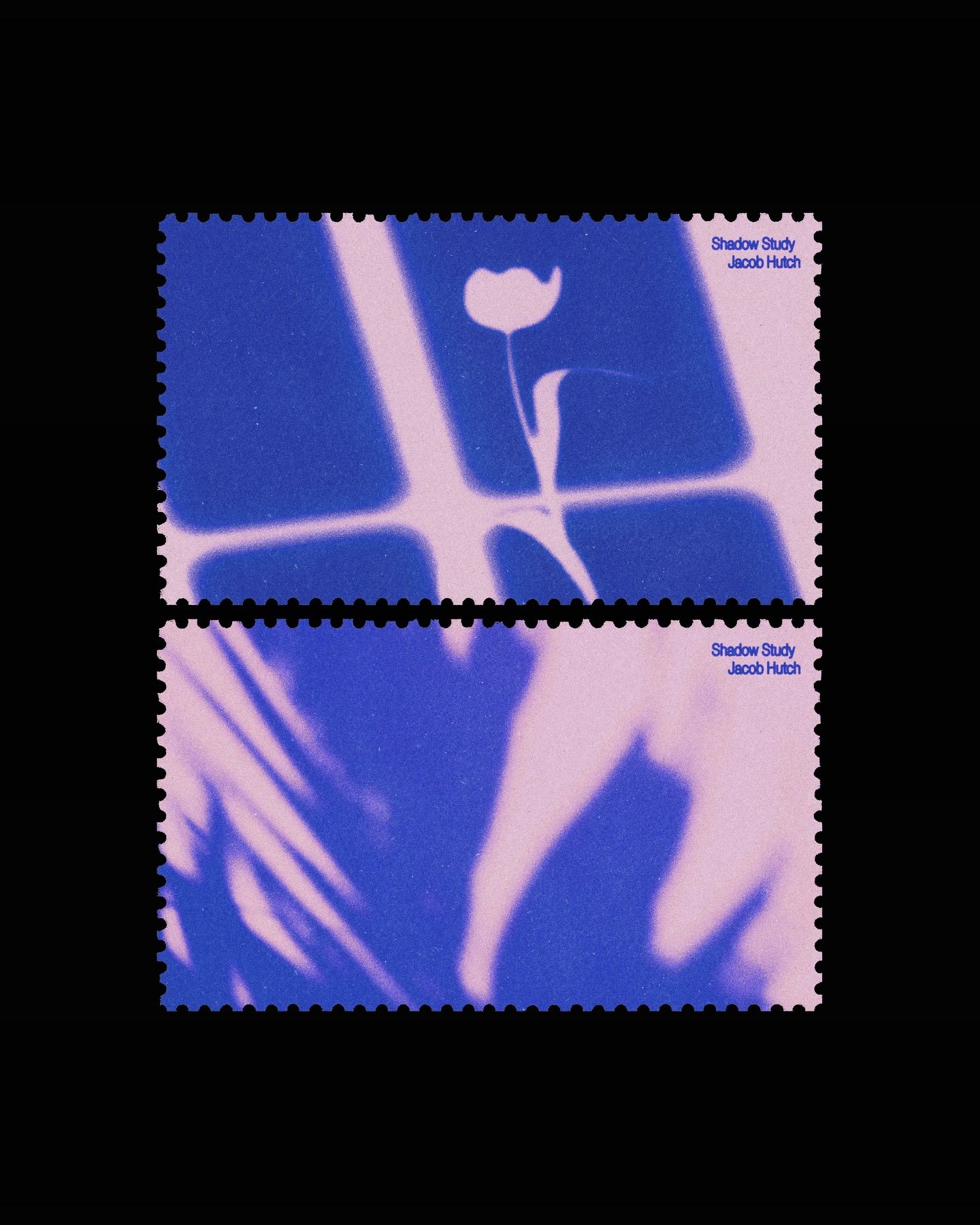 This image features two postage stamps with a strong, high-contrast graphic design centered around a stylized silhouette of a tulip against a deep blue background. The design employs stark white negative space to create a modern, minimalist, and somewhat ethereal visual experience.