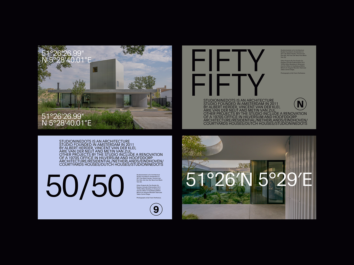 This visual presentation documents modern architecture through a combination of high-quality photographic documentation, precise geographic coordinates, and minimalist branding elements. The design emphasizes clean lines, spatial clarity, and the intersection of physical space with precise data points.