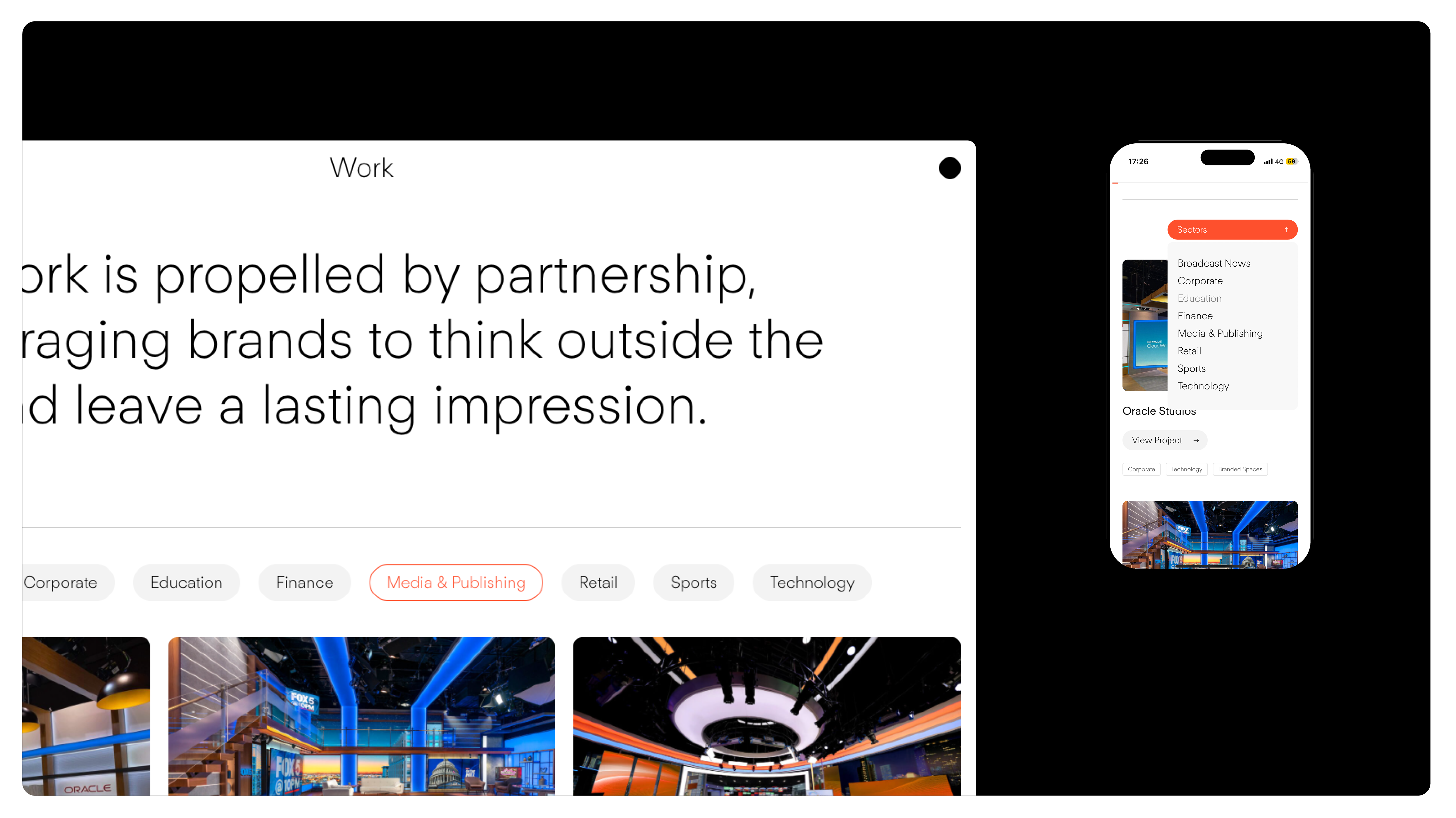 This design presents a clean, professional corporate presentation style, effectively blending persuasive text with categorized keywords and visual examples. The layout is structured and balanced, utilizing ample white space to ensure readability while showcasing various elements like text, thumbnails, and a mobile UI mockup.