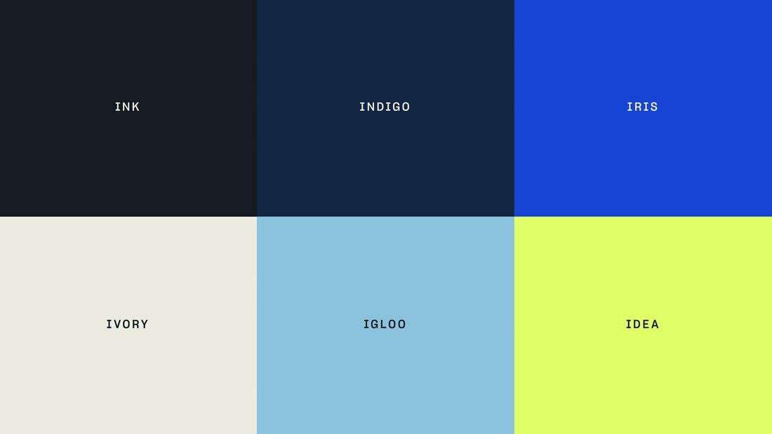 This image presents a clean, modern, and highly structured color palette divided into six distinct quadrants. The design relies on strong blocks of solid color to create a sophisticated and professional visual identity.