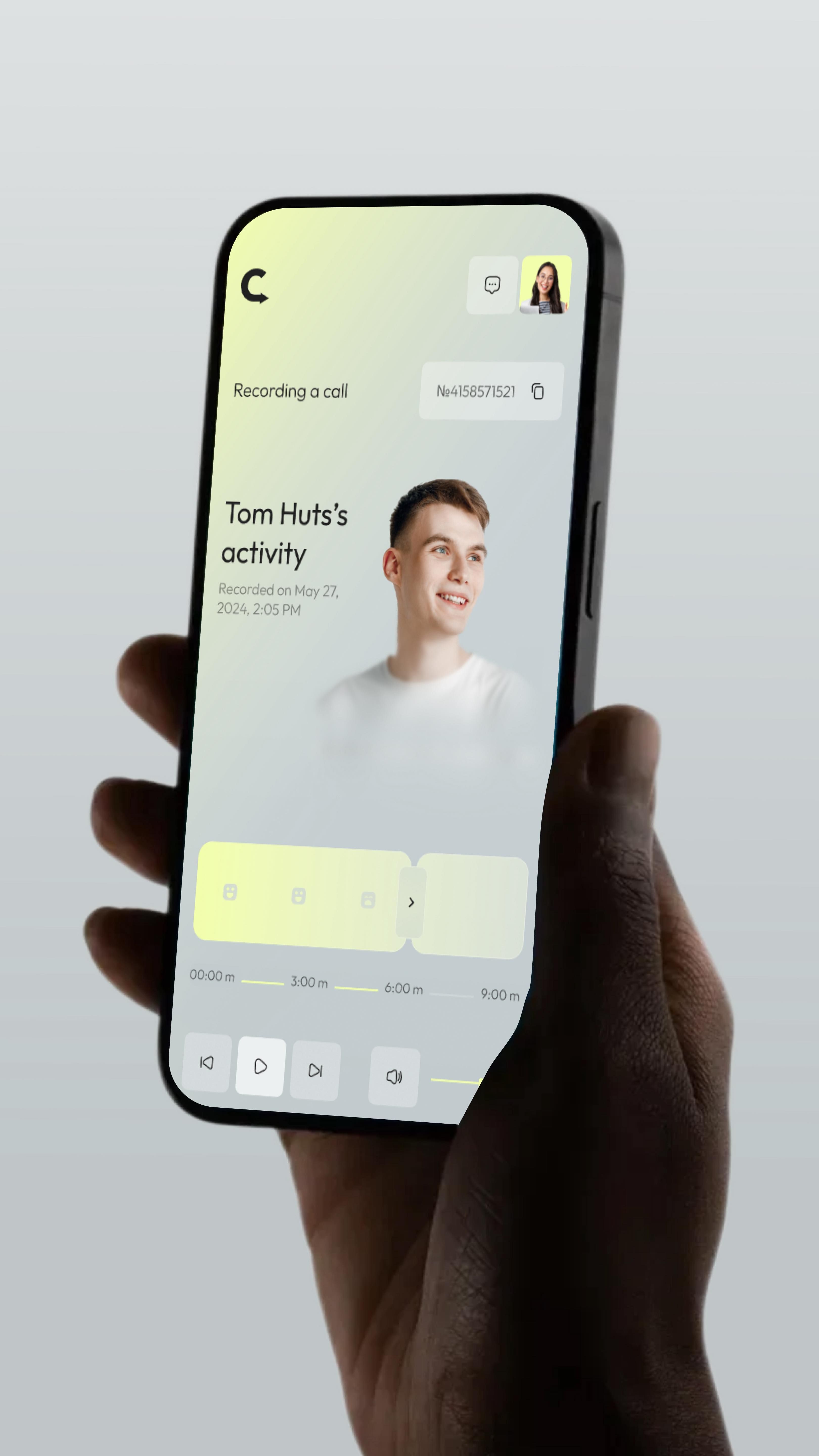 A minimalist mobile app interface displayed on a smartphone held in hand, featuring a clean layout with soft pastel yellow accents and a portrait-focused content card. The design emphasizes simplicity and user-centric interaction with ample whitespace and subtle typography.