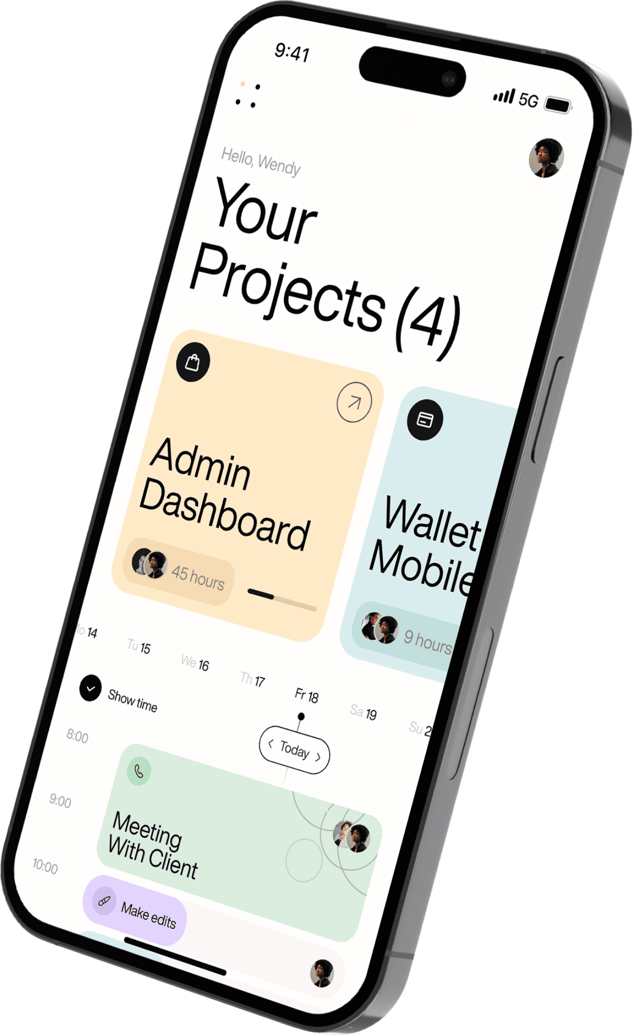 A modern mobile app interface showcasing a project management dashboard with a clean, minimalist design. The layout features a card-based system with soft pastel accents and rounded corners, emphasizing a contemporary and user-friendly approach to digital product design.