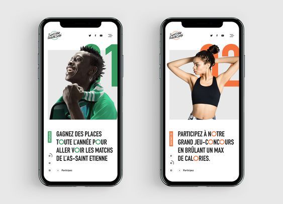 The image displays two mobile app screens featuring a bold, high-contrast design typical of sports or promotional content. The layout is clean and modern, focusing heavily on a central photographic element overlaid with large, prominent numbers.