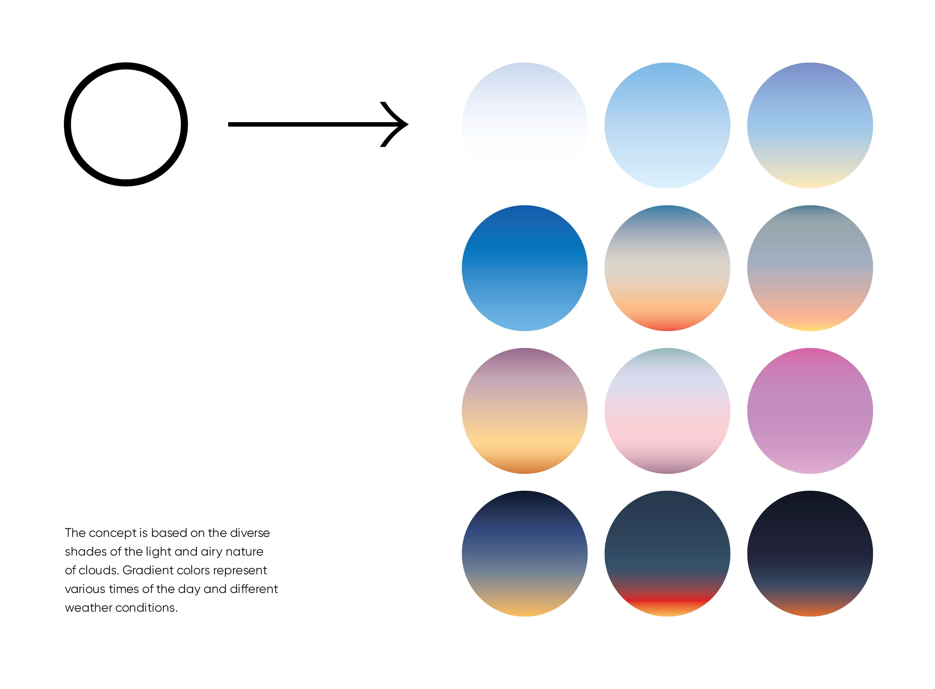 This design employs smooth, soft color gradients to visualize atmospheric phenomena like clouds and the changing light of the day. The visual language is airy and ethereal, successfully mapping complex natural conditions onto a harmonious spectrum of blues, pinks, and grays. It is a clear demonstration of color transition and mood setting.
